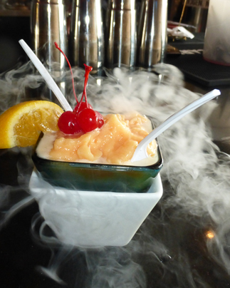 Nitrogen infused peach portrait cocktail from Art Burger Sushi